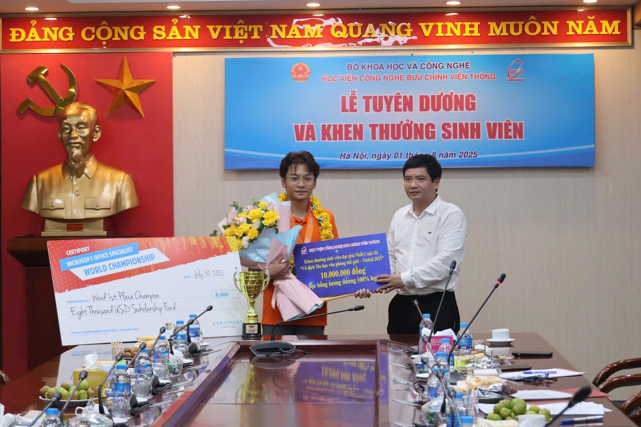 Sáng ngày 1/8/2025, Học viện Công nghệ Bưu chính Viễn thông (PTIT) long trọng tổ chức buổi gặp mặt và tuyên dương sinh viên Đỗ Hải Long, lớp D22CQTC02-B, người vừa xuất sắc giành Giải Nhất Thế giới – Huy chương Vàng hạng mục Microsoft Word (Microsoft 365 Apps) tại Cuộc thi Vô địch Tin học Văn phòng Thế giới – Microsoft Office Specialist World Championship 2025 (MOSWC 2025). Đây là lần đầu tiên trong lịch sử, PTIT có sinh viên bước lên bục cao nhất của sân chơi công nghệ văn phòng hàng đầu thế giới, đánh dấu một cột mốc đáng tự hào cho Học viện và cho cộng đồng sinh viên Việt Nam.
